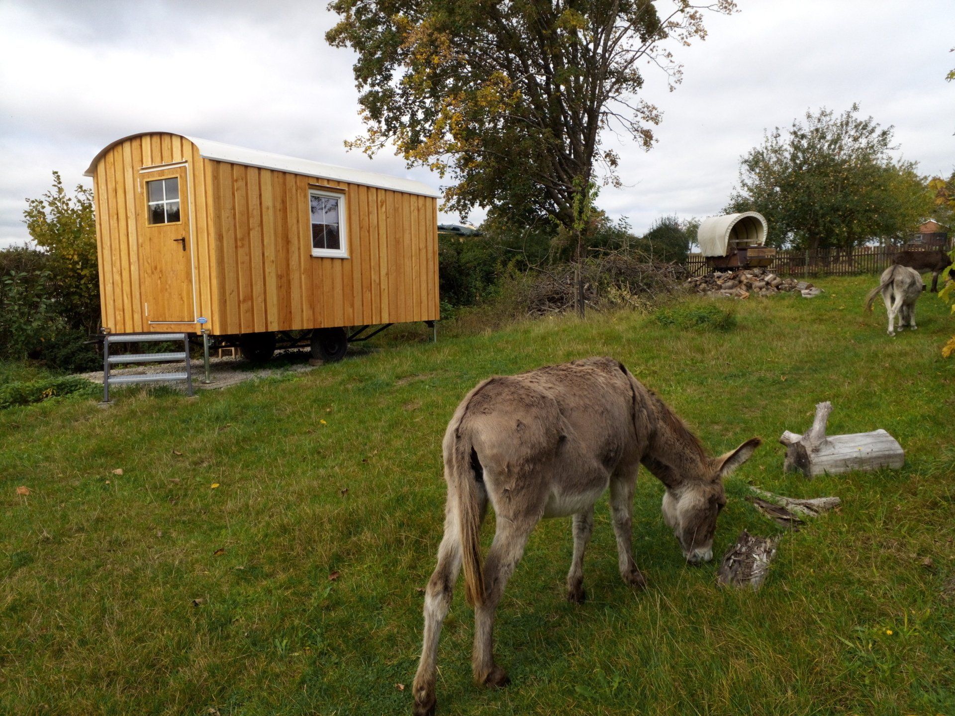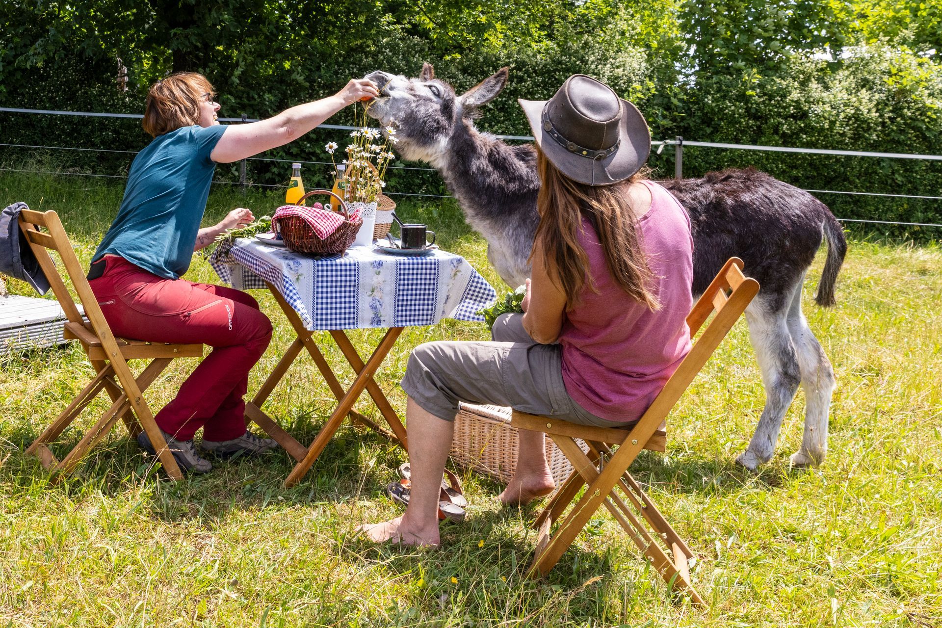 Aufwachen im Schäferwagen und Frühstücken unter Eseln