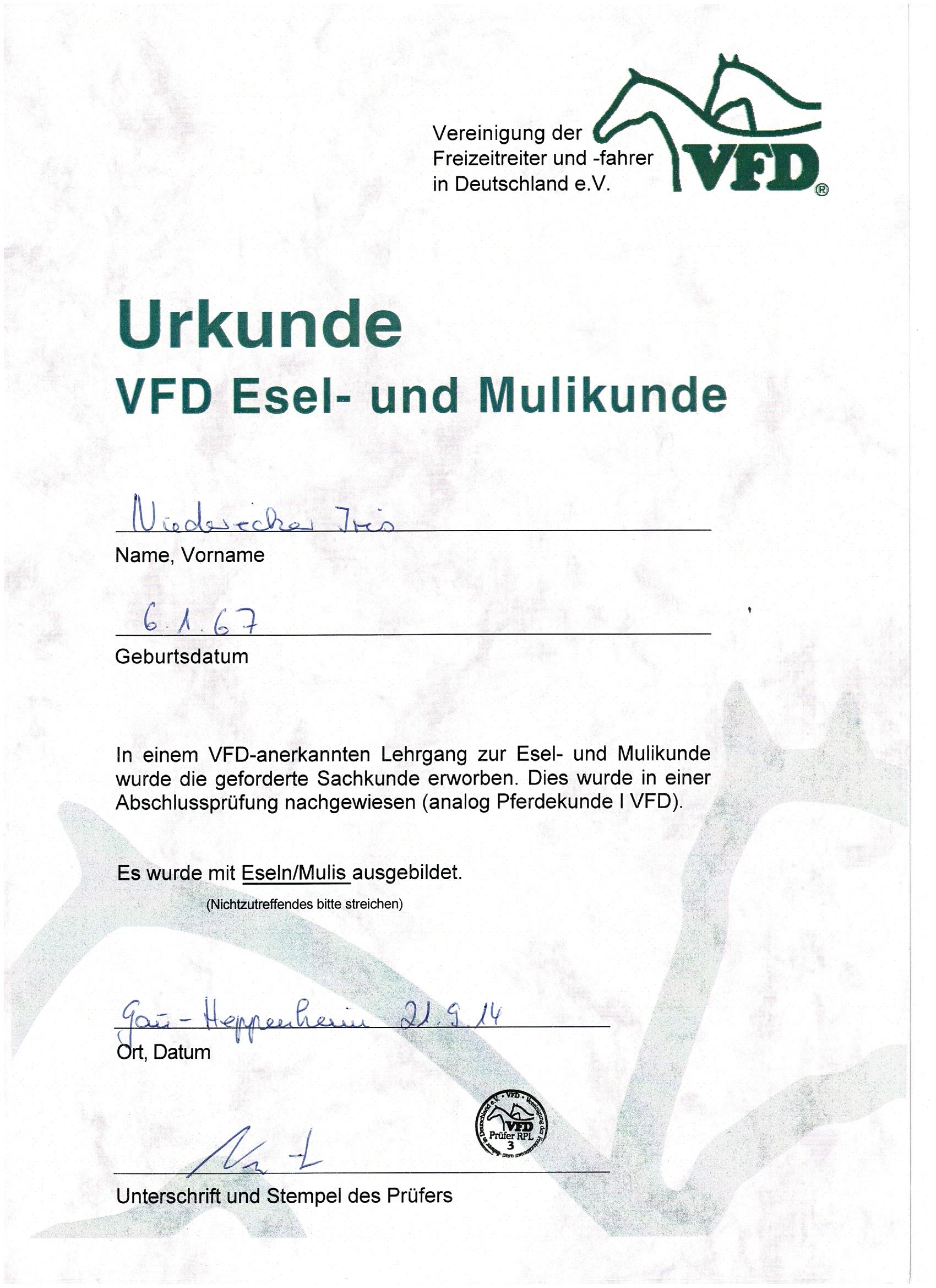 Iris Niederecker, propietaria de una granja de burros, bióloga cualificada, formada en un centro de formación reconocido por VFD en Turingia, adquirió una licencia para conducir carruajes comerciales en Marburg, varios talleres y muchos años de experiencia en equitación, idiomas: alemán / inglés / (probado en español )