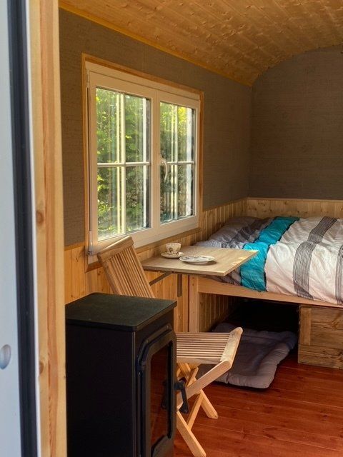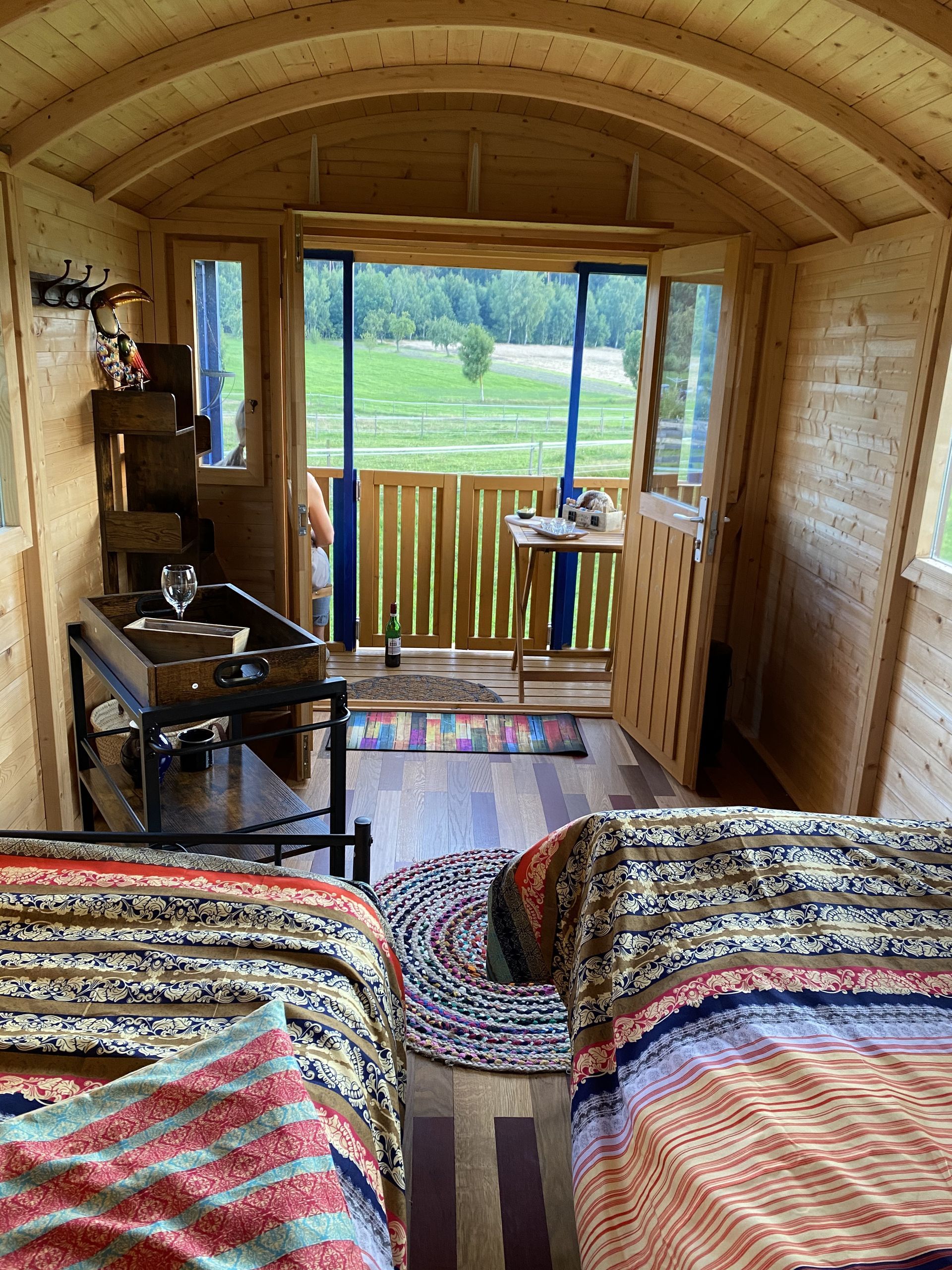 Schäferwagen mit Blick auf die Weide, mit Grill/Feuerschale